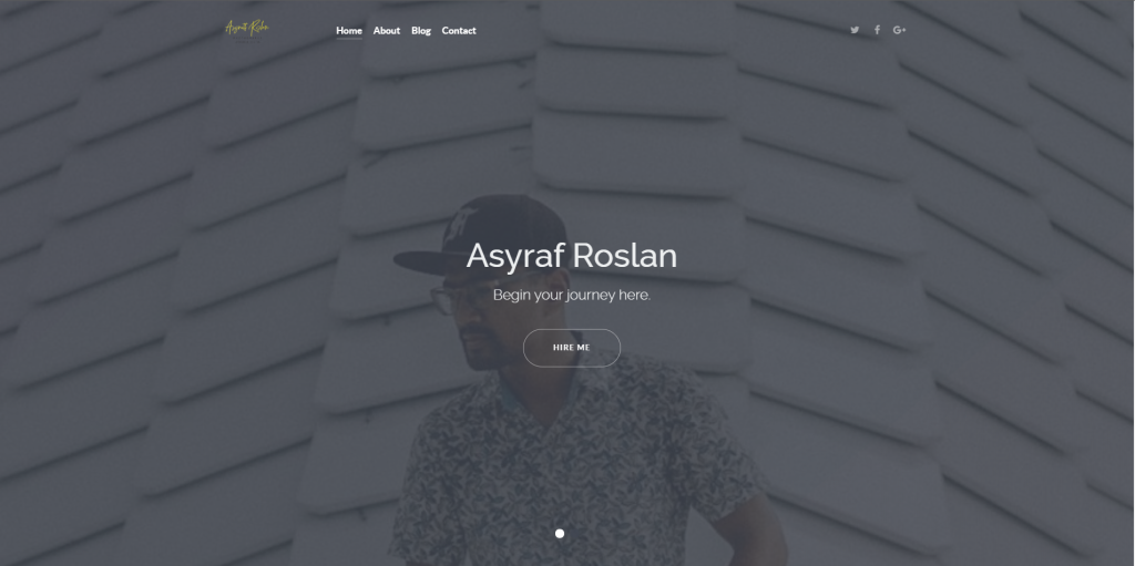 - A visually appealing landing section featuring the text “Aizat Roslan / your journey here” with an inviting “HIRE ME” call-to-action.